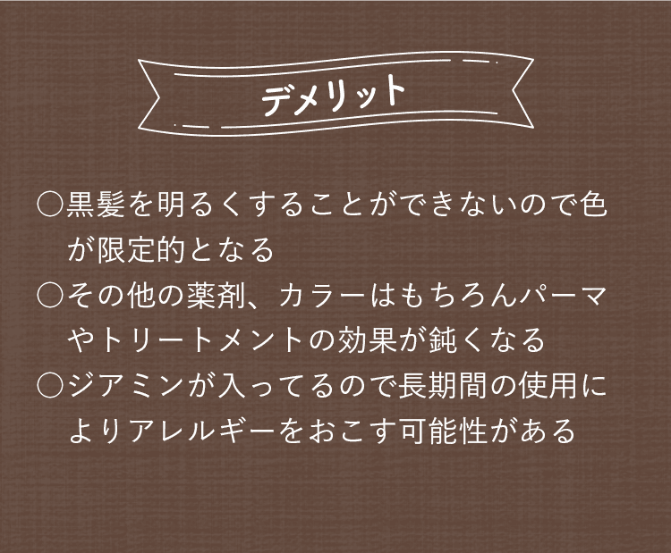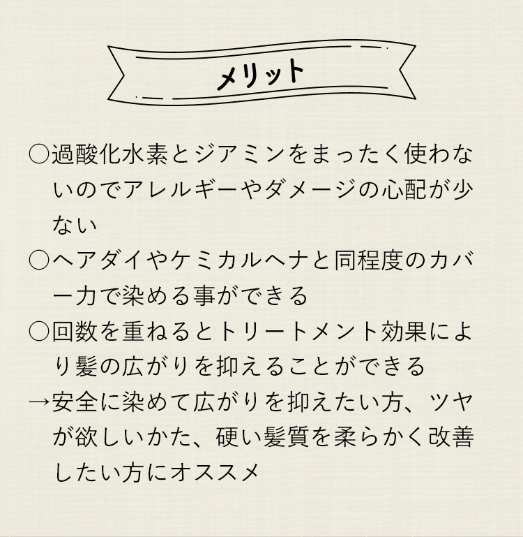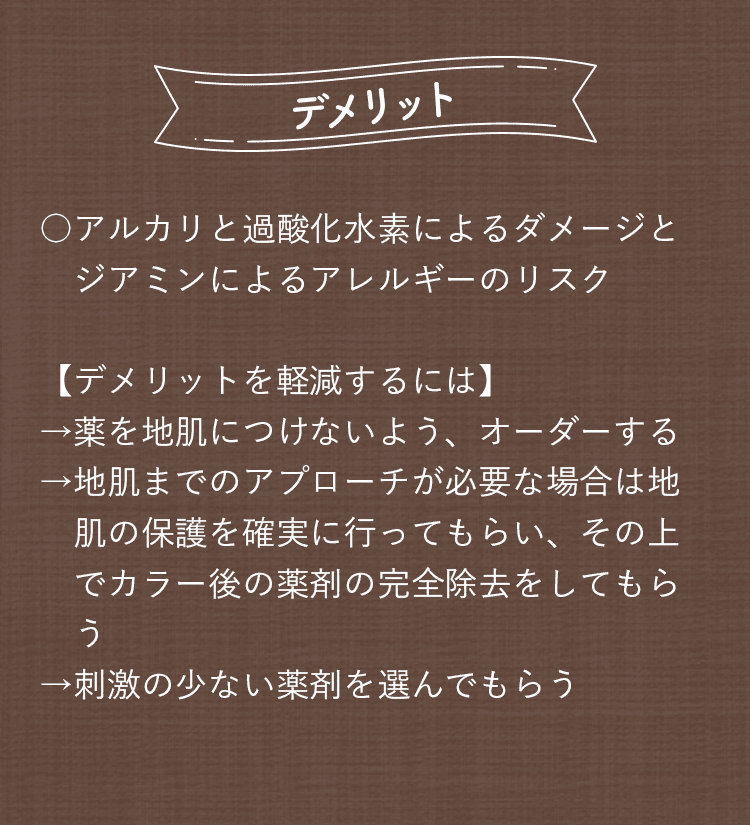 市販のカラー剤で染める方もいらっしゃいますが、市販薬は出来るだけ強く染まるよう国で定められた基準の限度まで強く作られている製品が多いため、頭皮や髪へのダメージを考えると専門的な知識や薬剤を持つサロンにお任せすることを強くおすすめします。