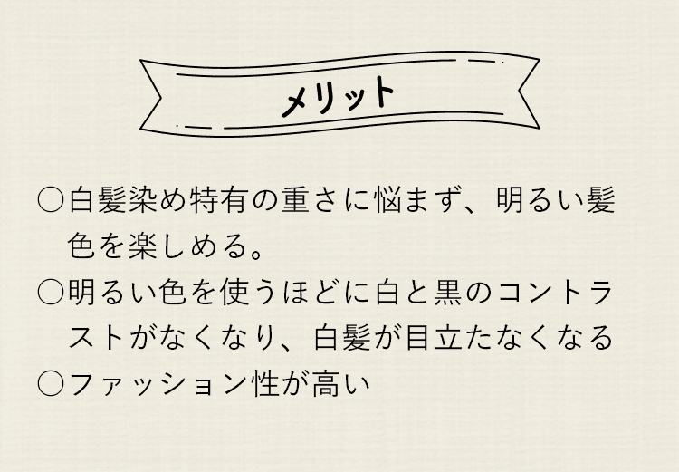 上記は一例ですが、ご自身が白髪を気にする理由を分析できれば、お客様に最も合った方法で白髪への対応がしやすくなります。