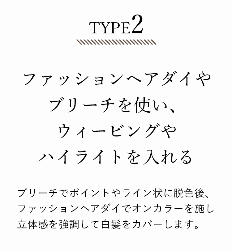 白髪の生え方によってポイントカラーやハイライトとして見せる事もできます。